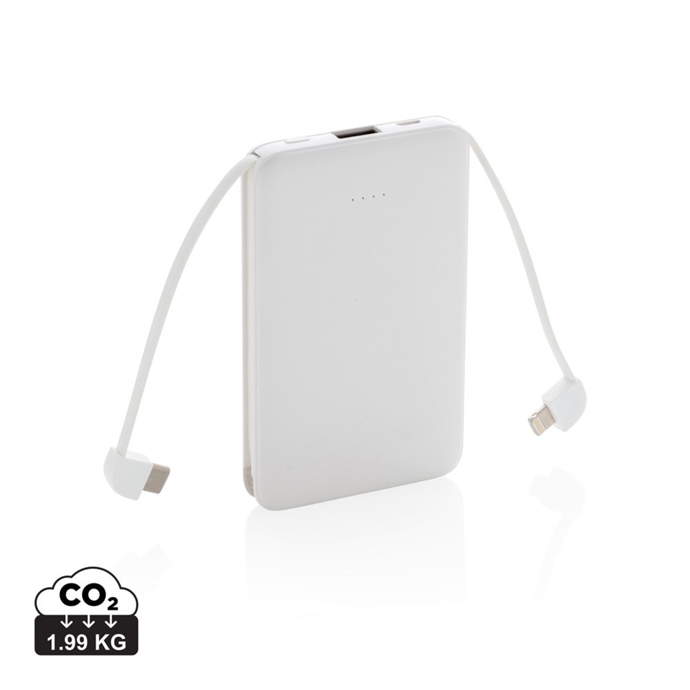 Compact and flat 5.000 mAh powerbank made out of ABS that is easy to take with you wherever you go. With the 3 in 1 integrated TPE cables the powerbank is compatible with all mobile devices in the market and directly ready for use. When fully charged it will provide you with enough energy to re-charge your mobile phone up to two times. The powerbank contains a long lasting grade A 5000 mAh high-density lithium polymer battery. The power indicators will indicate the remaining energy level so you always know when to re-charge. Input: 5V/2A Output 5V/2A.