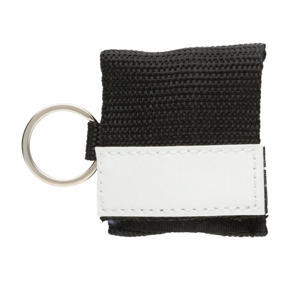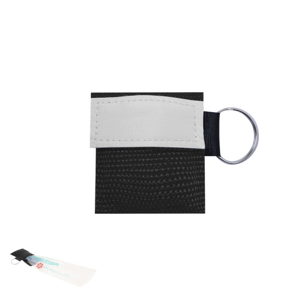 Small CPR face shield for mouth to mouth resuscitation, in webbing style pouch with velcro closure and steel keyring. Conform EN 13485:2016. With non-return valve. Note: This item can only be printed in black.